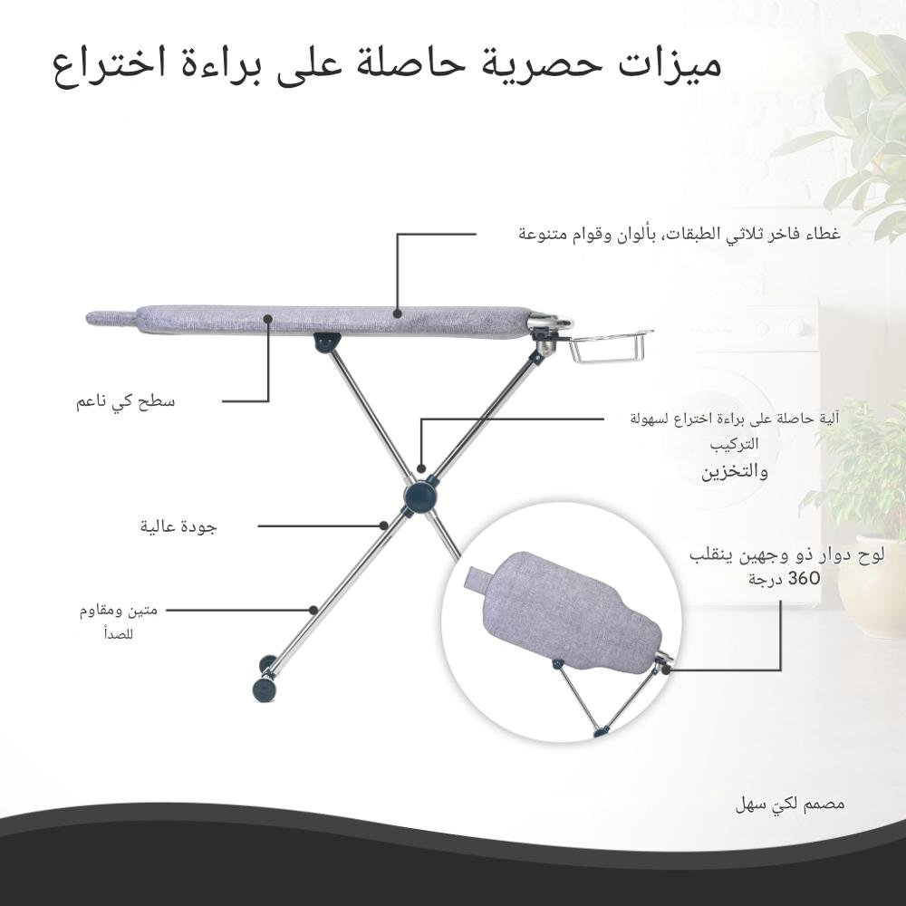 تصميم مبتكر دوار مزدوج الجوانب، يدور بحرية 360 درجة، سهل التعامل مع المناطق الحساسة مثل الياقات والأساور ودرزات البنطلونات. حتى الملابس الكبيرة مثل العباءات العربية والحجابات التقليدية يمكن كيّها بسلاسة.